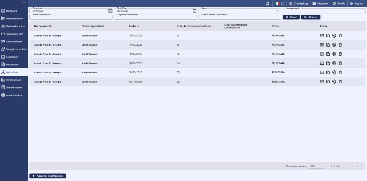 Cartsan è oggi il gestionale di riferimento per la Medicina del Lavoro in Italia con oltre 2.000 clienti attivi e circa 5.000 Medici Competenti che lo utilizzano quotidianamente. Tuttavia, circa il 95% degli utenti non dispone di un processo automatizzato per la gestione dei servizi di Laboratorio.